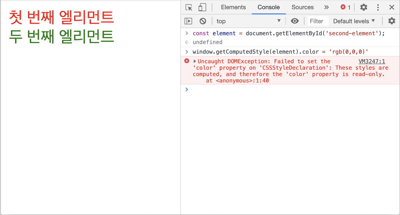 따라서 getComputedStyle()메소드를 이용하여 새로운 스타일 변경을 시도하면, 아래와 같이 에러가 발생하게 된다.