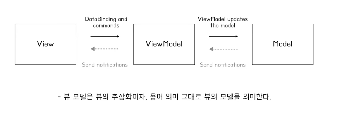 - 주의할 점으로, 뷰모델에선 뷰의 버튼 혹은 리스트뷰와 같은 뷰 타입을 참조하지 않는다.