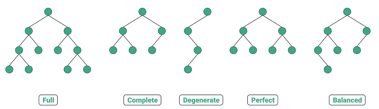 아래 이미지 순서대로 진이진트리(Full), 완전이진트리(Complete), 편향된 이진트리(Degenerate), 포화이진트리(Perfect), 균형이진트리(Balanced)