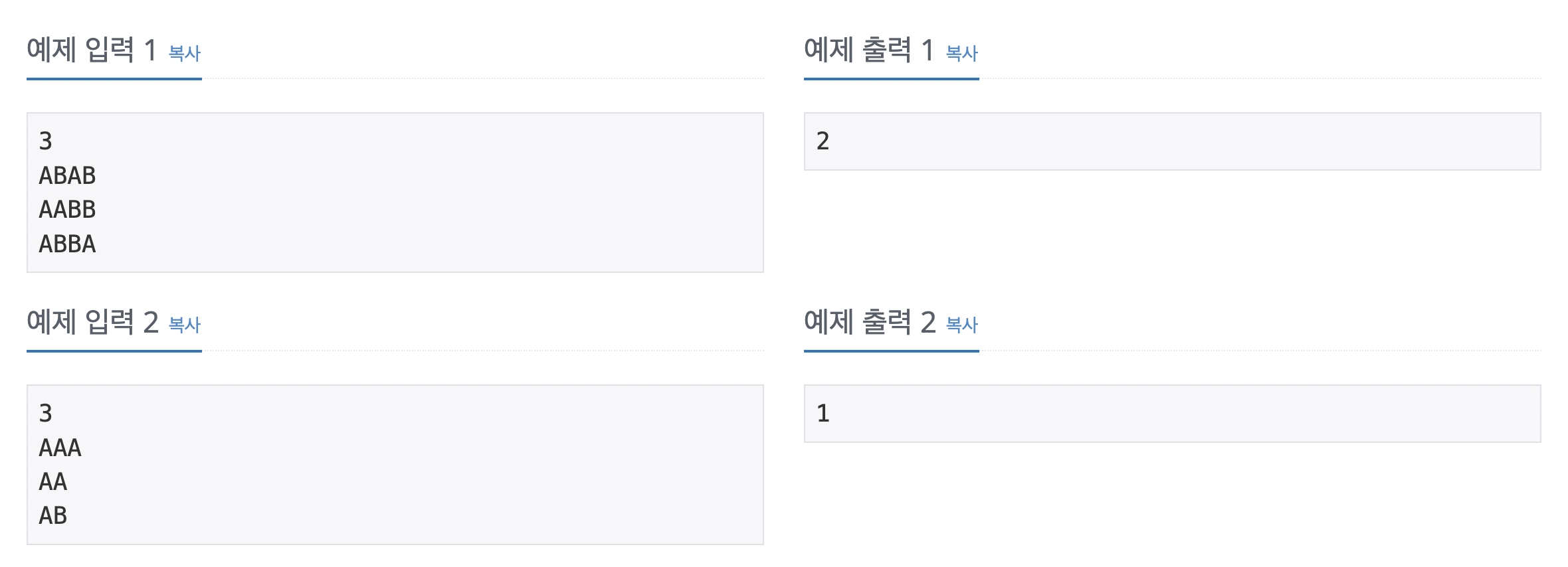 평석이는 단어 위로 아치형 곡선을 그어 같은 글자끼리(A는 A끼리, B는 B끼리) 쌍을 짓기로 하였다. 만약 선끼리 교차하지 않으면서 각 글자를 정확히 한 개의 다른 위치에 있는 같은 글자와 짝 지을수 있다면, 그 단어는 '좋은 단어'이다. 평석이가 '좋은 단어' 개수를 세는 것을 도와주자.