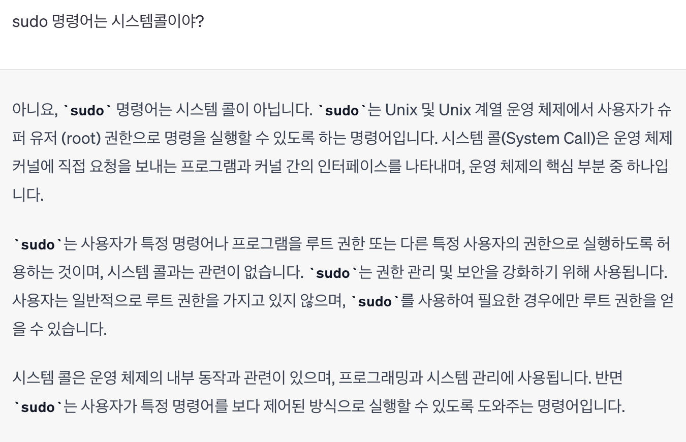 PS. GPT님의 말로는 sudo는 시스템콜이 아니라고 합니다.