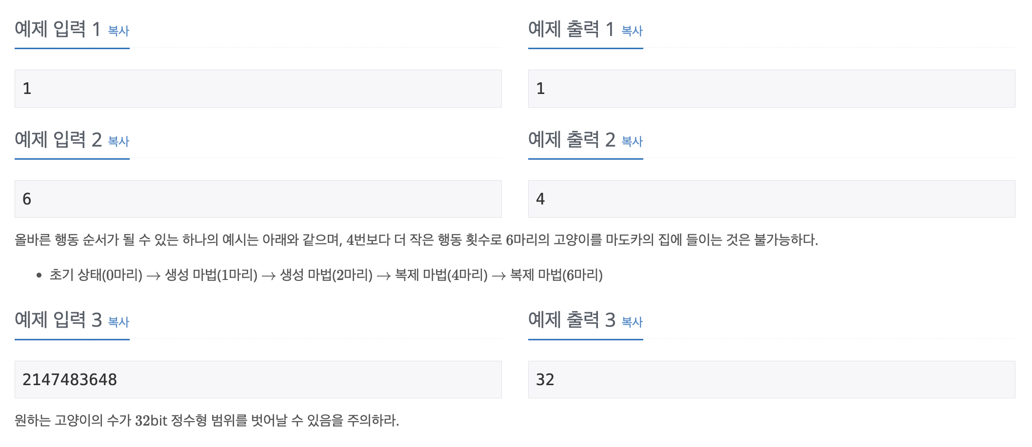 올바른 행동 순서가 될 수 있는 하나의 예시는 아래와 같으며, $4$번보다 더 작은 행동 횟수로 $6$마리의 고양이를 마도카의 집에 들이는 것은 불가능하다. 초기 상태($0$마리) $\rightarrow$ 생성