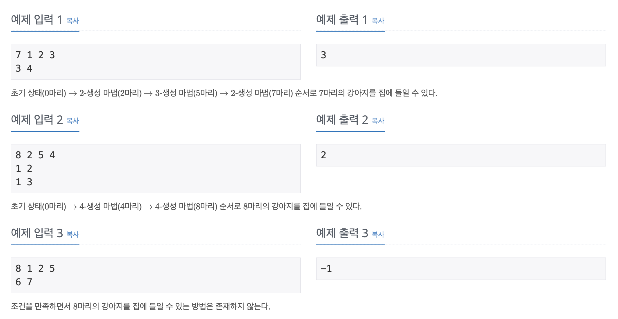 *즉 예제 입력 1번에 따르면 3~4마리일 경우 탈락이다.(강아지 생성이 초기화된다.)