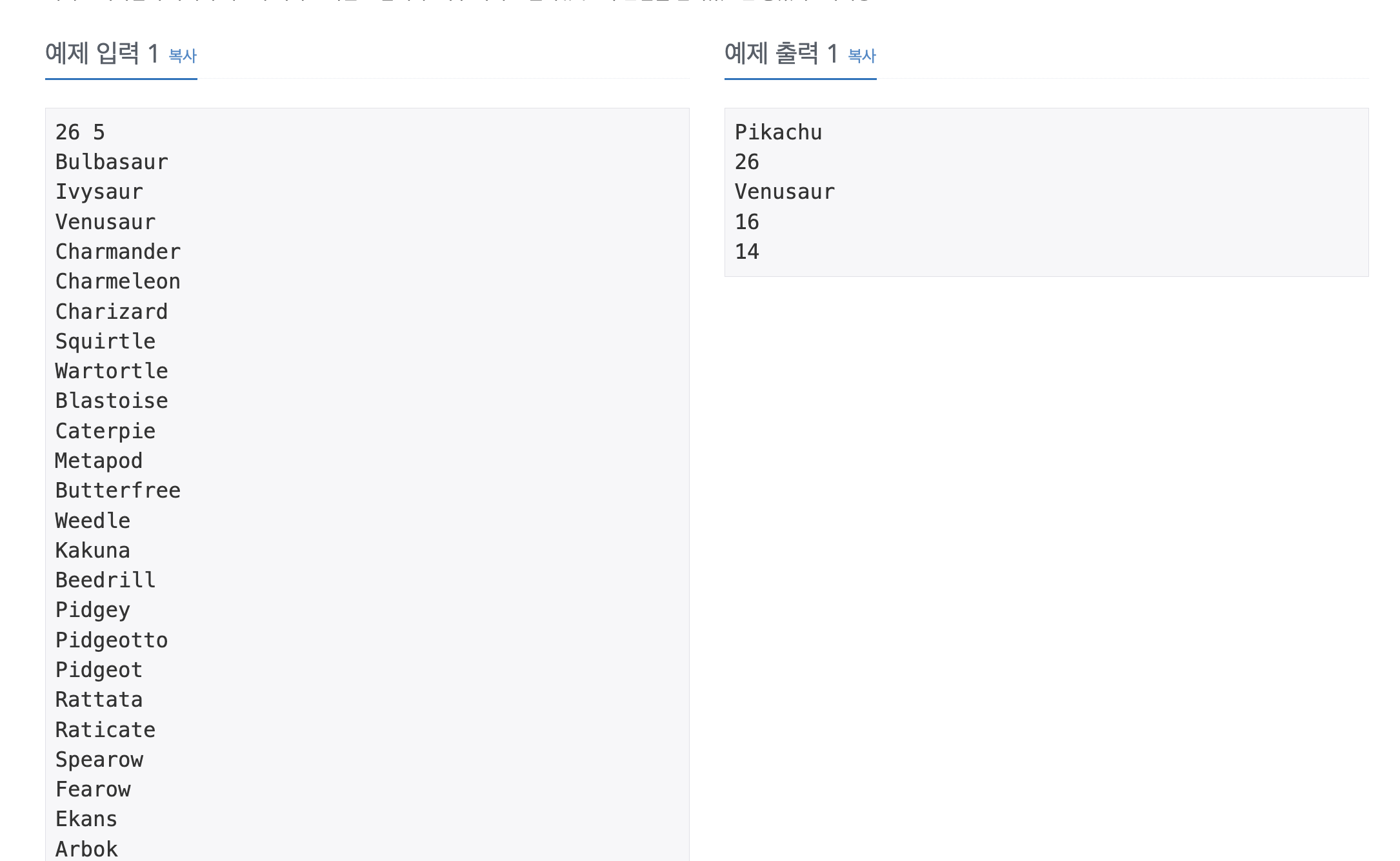 첫째줄엔 도감 등록 포켓몬 갯수 N와 시험 문제 갯수 M가 나오고