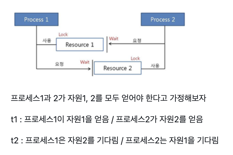한 프로세스가 자원을 요청했을 때, 동시에 그 자원을 사용할 수 없는 상황이 발생할 수 있음. 이때 프로세스는 대기 상태로 들어감