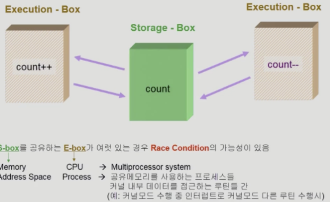 - 문제점 : 멀티 프로세서 환경에서 2개의 CPU가 동시에 커널 내부의 공유 데이터에 접근하여 조작하는 경우