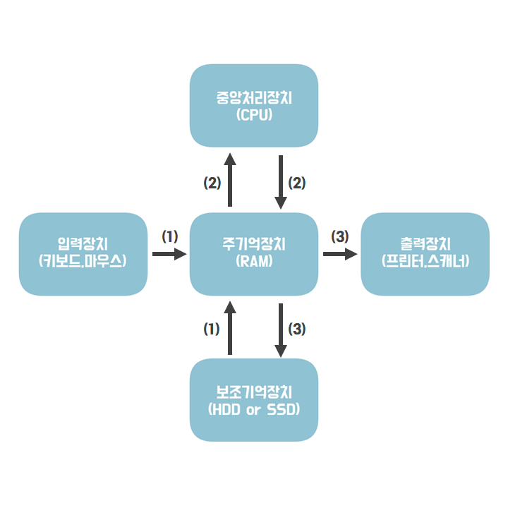 - Cache Memory(캐시 메모리): 컴퓨터 시스템의 성능을 향상시키기 위해 별도로 탑재된 캐시 전용 메모리. 레지스터에 이어 두번째로 빠른 속도로 접근 가능하다.