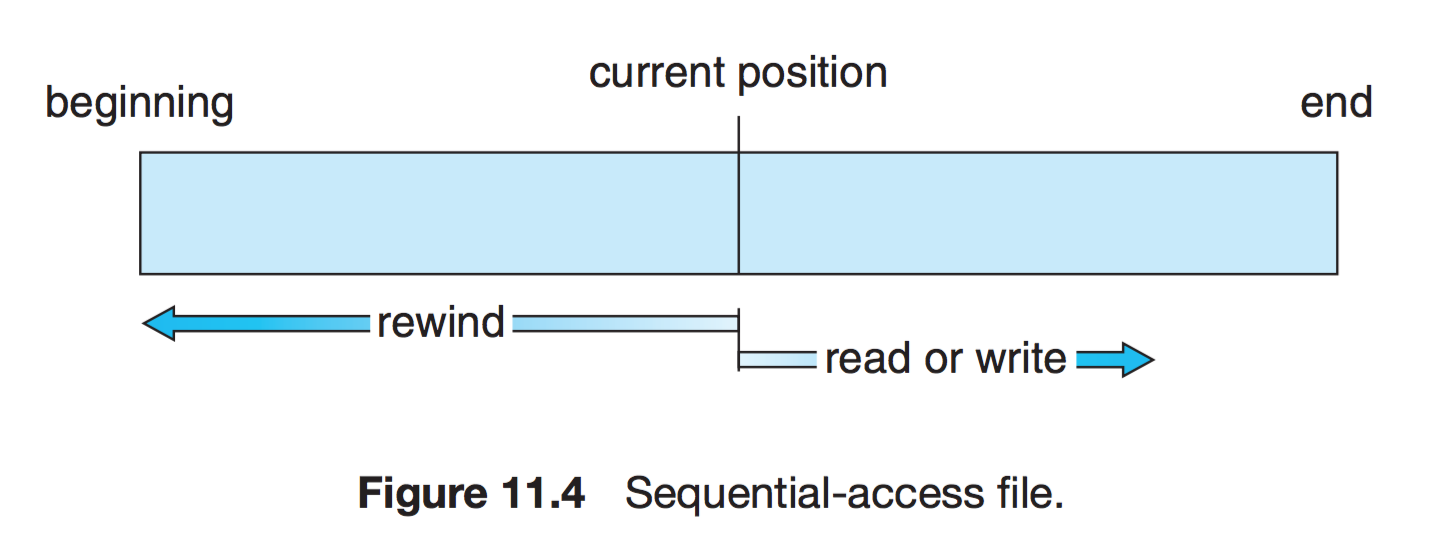 현재 위치를 가리키는 포인터에서 시스템 콜이 발생할 경우 포인터를 앞으로 보내면서 read와 write를 진행. 뒤로 돌아갈 땐 지정한 offset만큼 되감기를 해야 한다. (테이프 모델 기반)